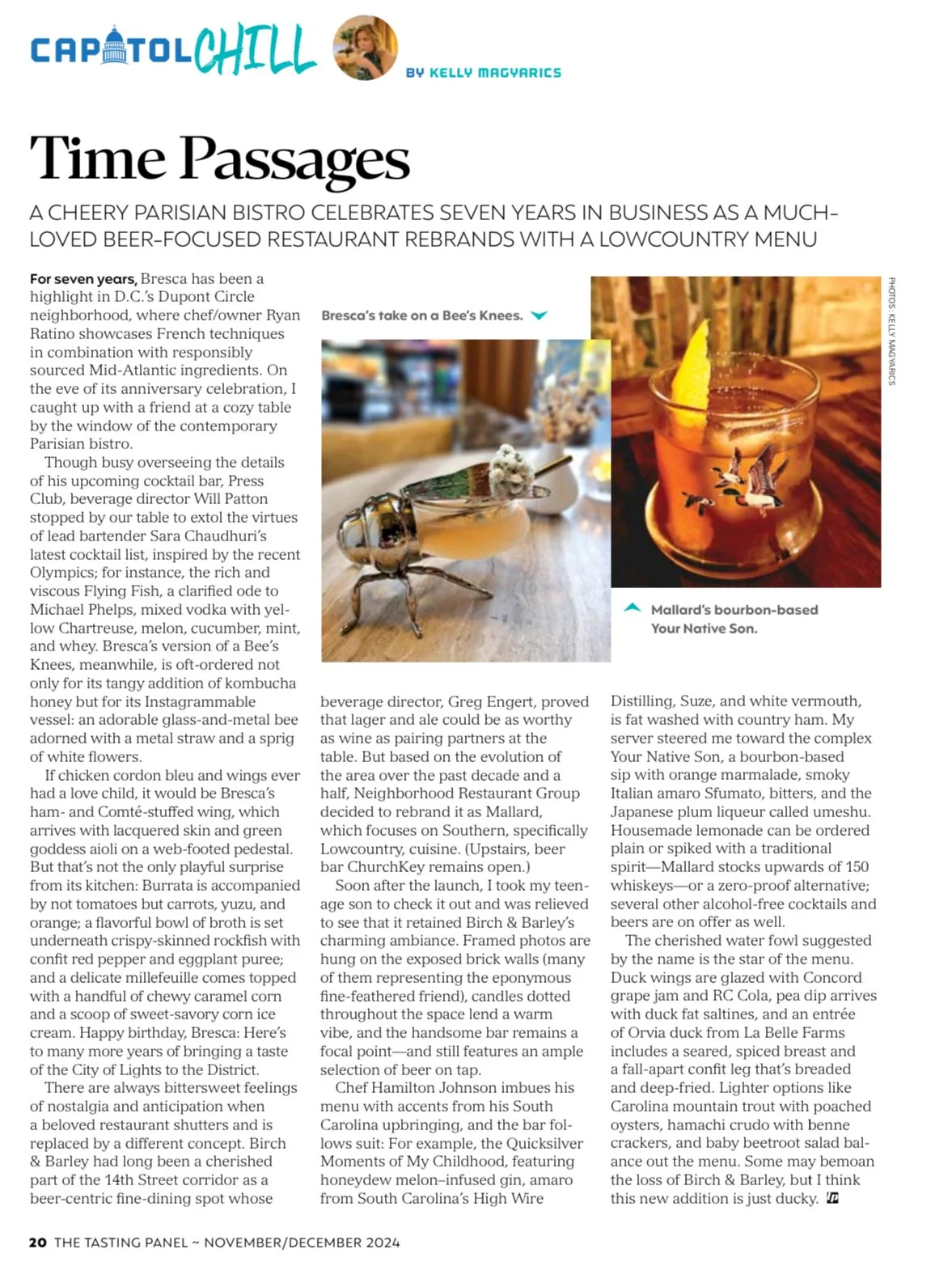 “Though busy overseeing the details of his upcoming cocktail bar, Press Club, beverage director Will Patton stopped by our table to extol the virtues of lead bartender Sara Chaudhuri’s latest cocktail list, inspired by the recent Olympics; for instance, the rich and viscous Flying Fish, a clarified ode to Michael Phelps, mixed vodka with yellow Chartreuse, melon, cucumber, mint, and whey.”